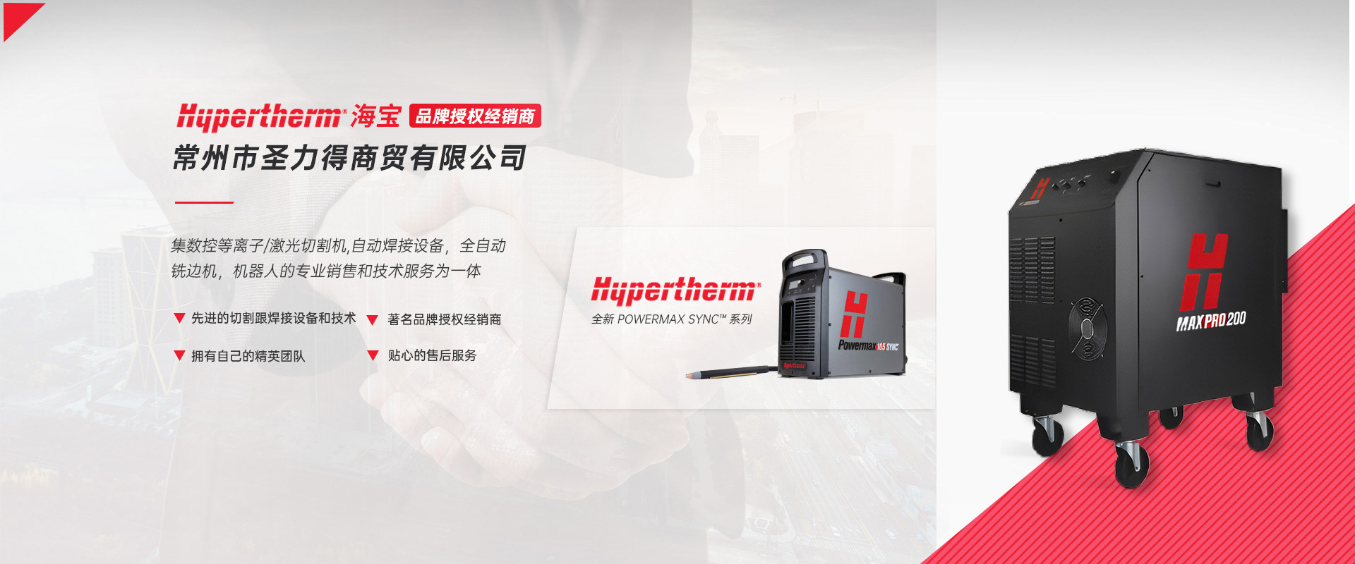 常州市圣力得商贸有限公司是一家集数控等离子/激光切割机,自动焊接设备,全自动铣边机,机器人的专业销售和技术服务为一体的公司。本公司是世界品牌Hypertherm(美国海宝)公司的授权经销商。  公司是一支技术稳定、服务优良、富有朝气的精英团队。公司致力于将国外先进的切割跟焊接设备和技术介绍给中国的机器制造商和终端用户,并为用户提供品质的产品和完善的售后服务。  公司主要代理以下产品:  1.美国海宝Hypertherm等离子机用电源,手持电源,原装易损件及备件  2.韩国赛拉科(CERACO)铣边机,南京顶瑞自动焊接小车  3.迈誓坦(MicroStep),日本田中(TANAKA),武汉法利莱(FARLEY-LASERLAB),江苏博大品牌等离子切割机,激光切割机及维修配件?! ?.美国海宝,美国飞马特,凯尔贝等原装正品易损件及配件  5.激光切割机,等离子切割机,火焰切割机升级,安装与调试及技术升级改造项目  6.机器人焊/切生产线  热忱欢迎广大用户前来询价及洽谈。